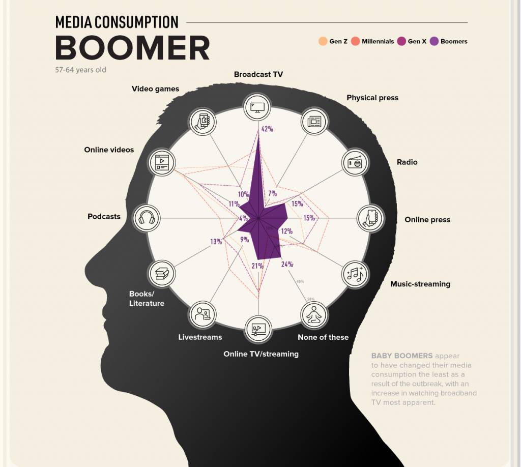- Un pronunciado gap generacional en la manera de gestionar esta crisis que podría ser un indicativo de cómo será el comportamiento de los consumidores en la nueva normalidad. Un estudio realizado en abril por Global Web Index sobre el consumo de medios durante la pandemia muestra estas diferencias. Entre otras, la generación Z destaca por un mayor consumo de vídeo (YouTube, TikTok, directos) mientras se percibe un aumento en el consumo de televisión tradicional por parte de la generación Boomer. Asimismo, el estudio refleja que el segmento Millennial realiza un notable consumo alrededor de diferentes tipos de medios. Con todo ello, es recomendable que las marcas que se dirigen a segmentos generacionales extremos presten atención a estos datos para marcar su hoja de ruta.